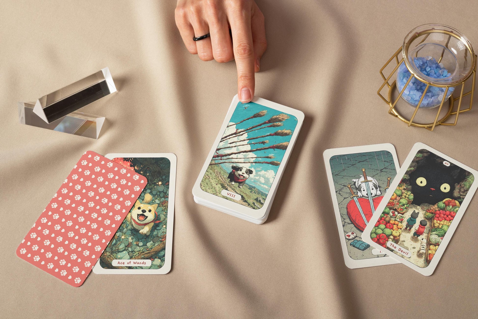 Instead of coins, this deck features radiant glowing pawprints to represent the material world. Symbolizing comfort, stability, and love in tangible, tail-wagging form.