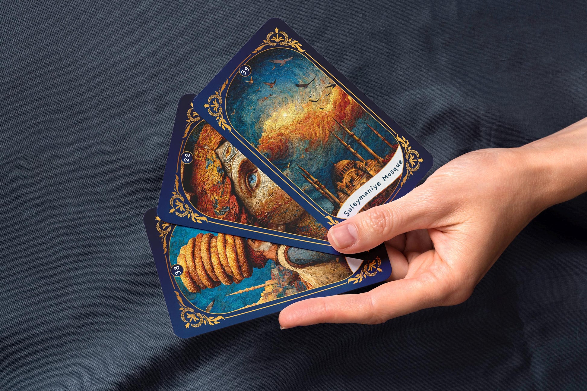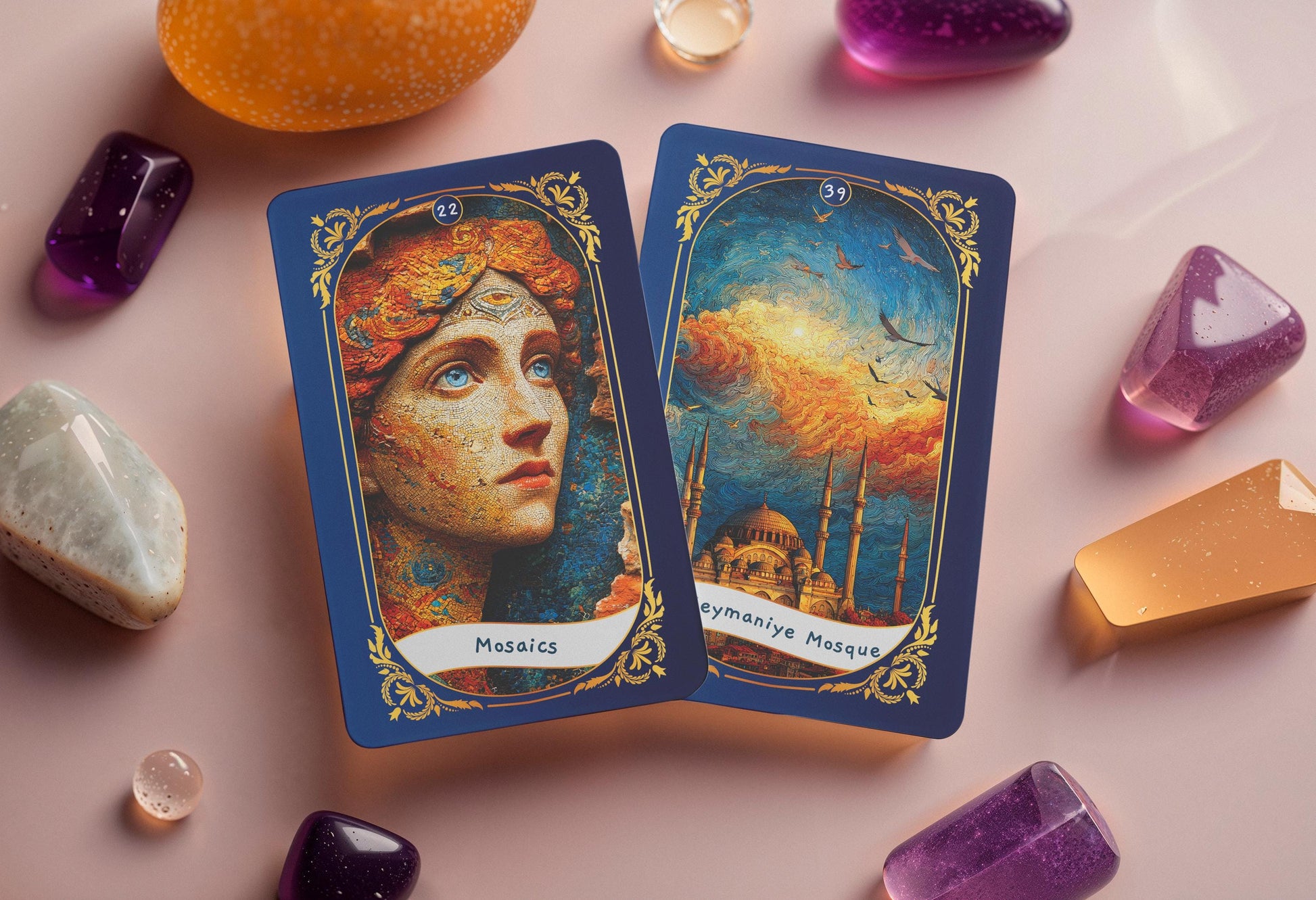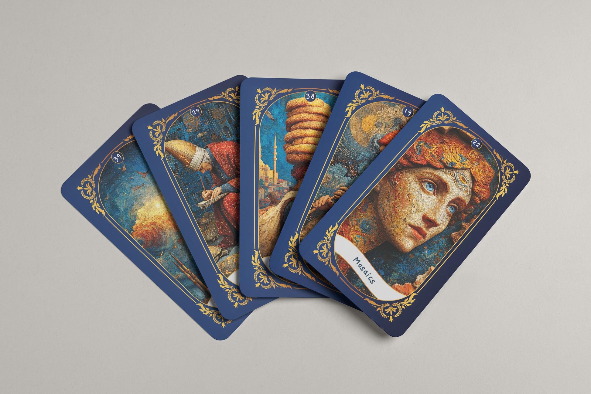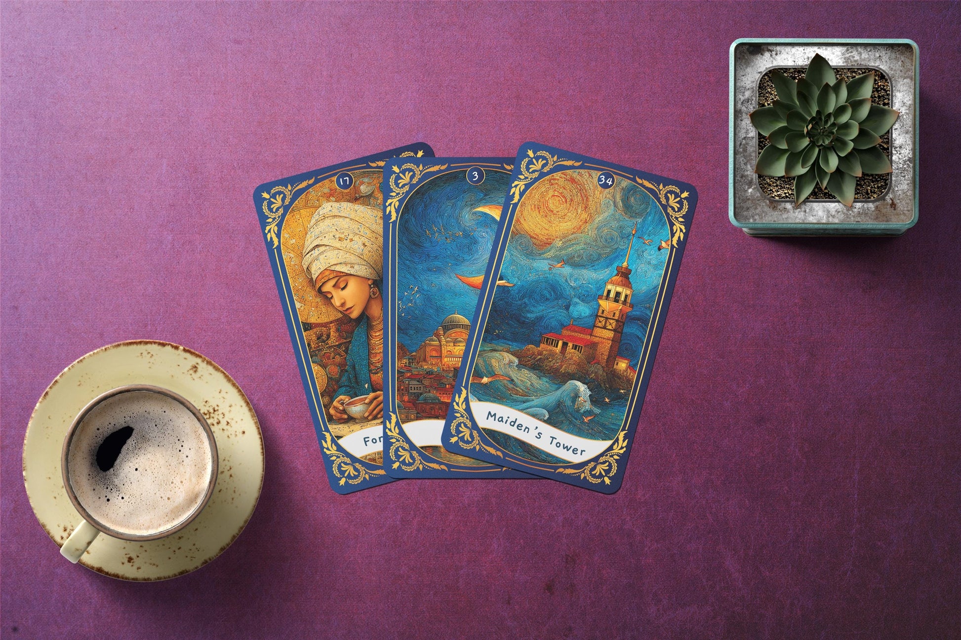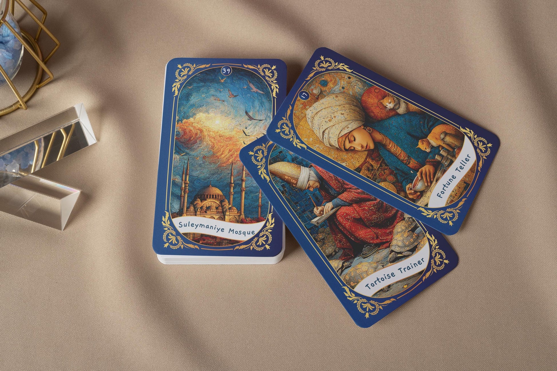 Osmanlı minyatürlerinden, Sufi şiirinden ve sembolik şehir manzaralarından ilham alan her kart birer kapıdır. Canlı renkler ve ince detaylar, çok katmanlı anlamlar sunar.